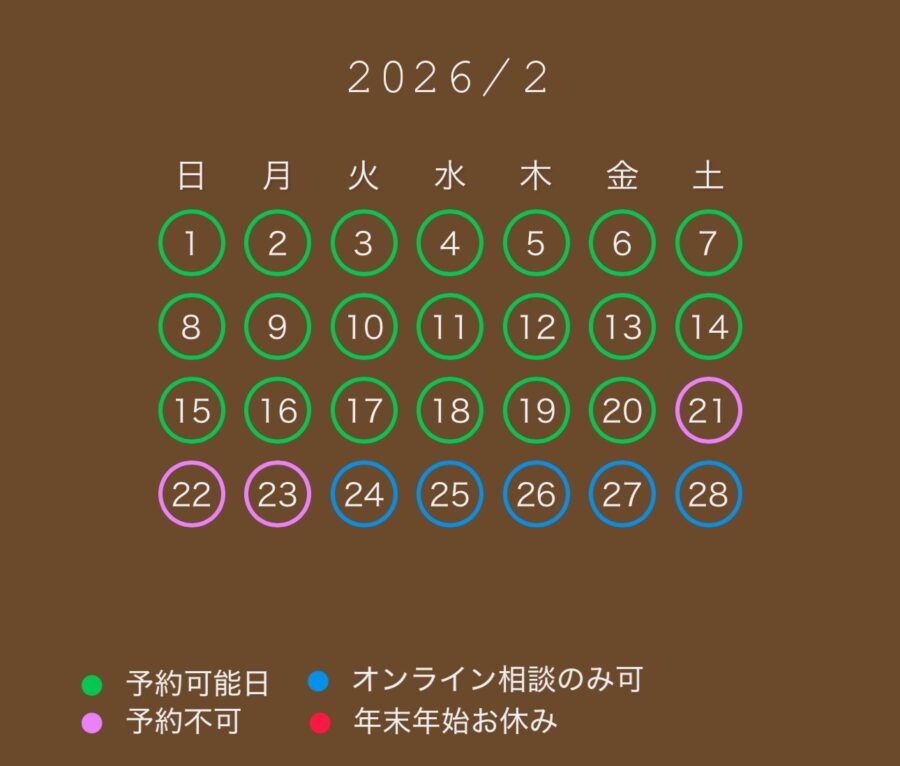 お手数をおかけしますが、下記カレンダーを参考にご予約お問い合わせいただきますようお願いします。