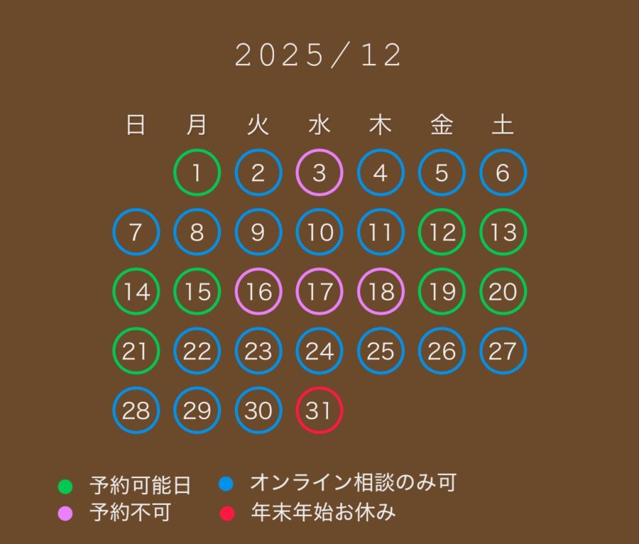さて、12月はけっこう予定が入っていて、オンラインカウンセリング以外のご予約可能日が少なくなっております。