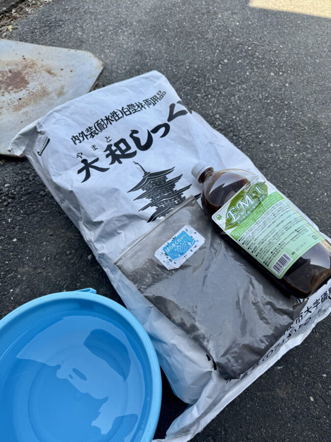 漆喰にはEM、バクチャー、珪藻土を素粒水でまぜてみました(^^)